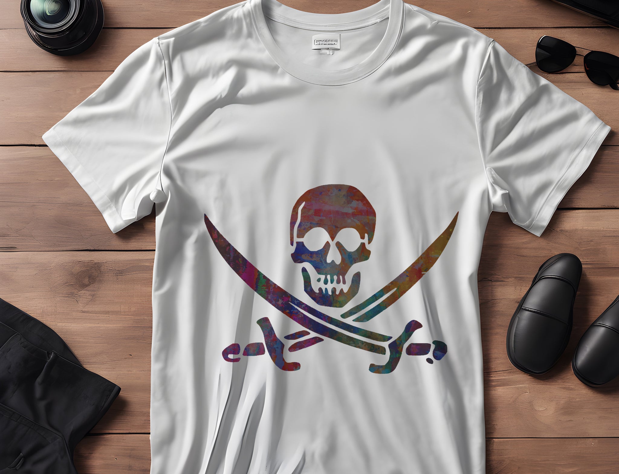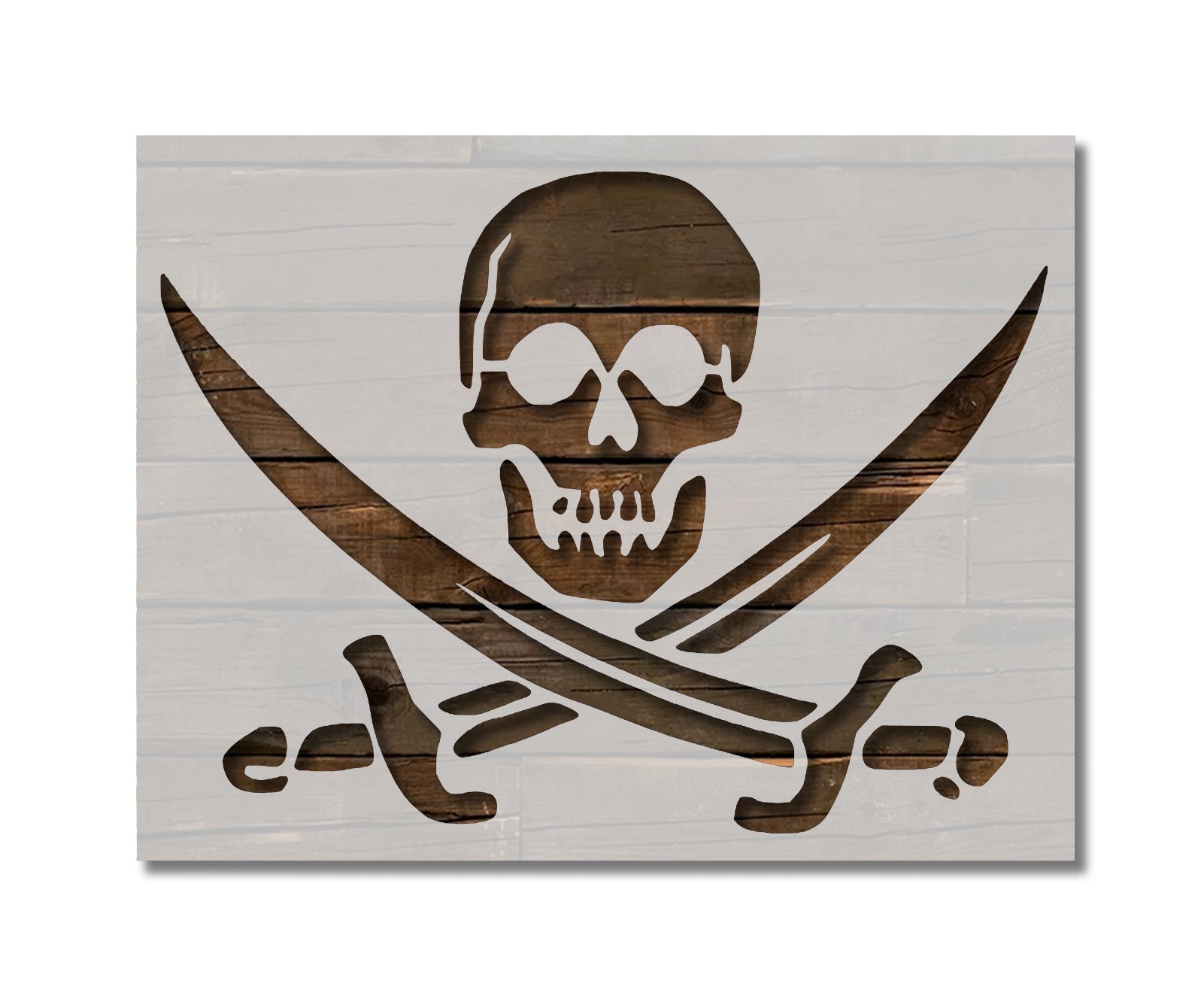 The design features a detailed skull with crossed swords, allowing for precise, professional-quality results. Compatible with acrylic paints, chalk paints, spray paints, and inks, it is ideal for hobbyists, party decorators, educators, and fans of nautical or pirate imagery.