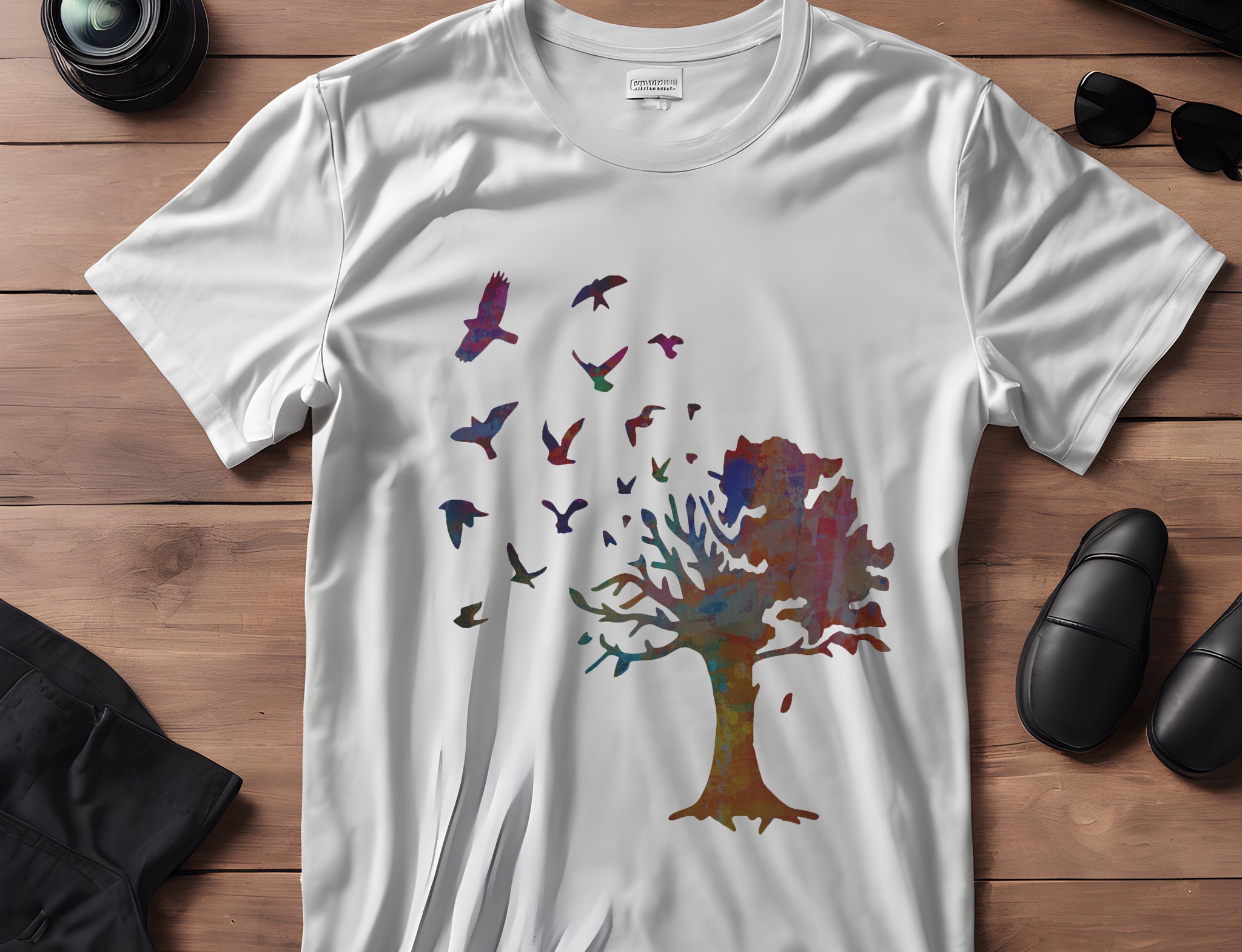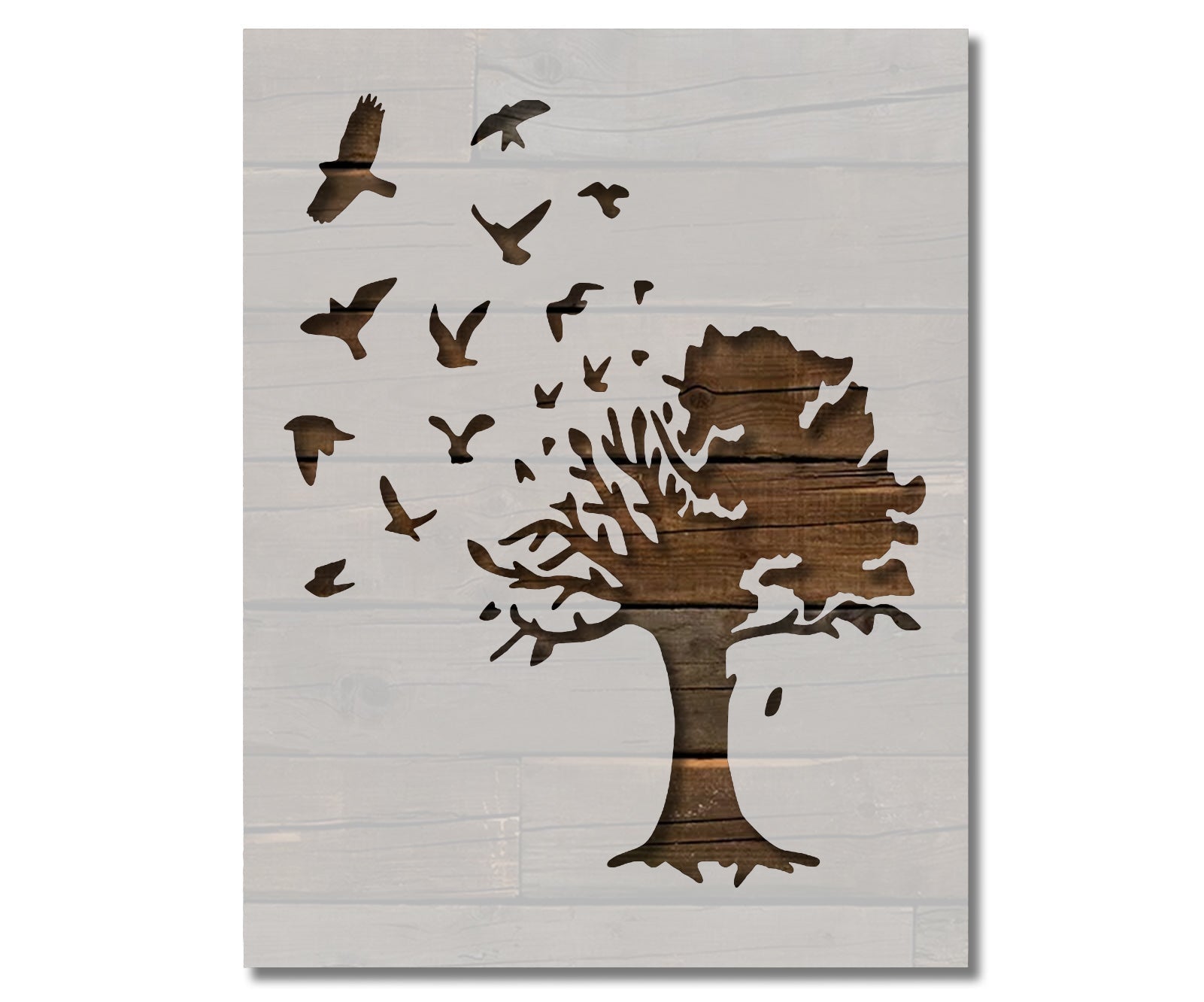 The design features multiple birds flying out of a large country tree for precise, professional-quality results. Compatible with acrylic paints, chalk paints, spray paints, and inks, it is ideal for hobbyists, decorators, and nature enthusiasts creating themed décor or personalized gifts.