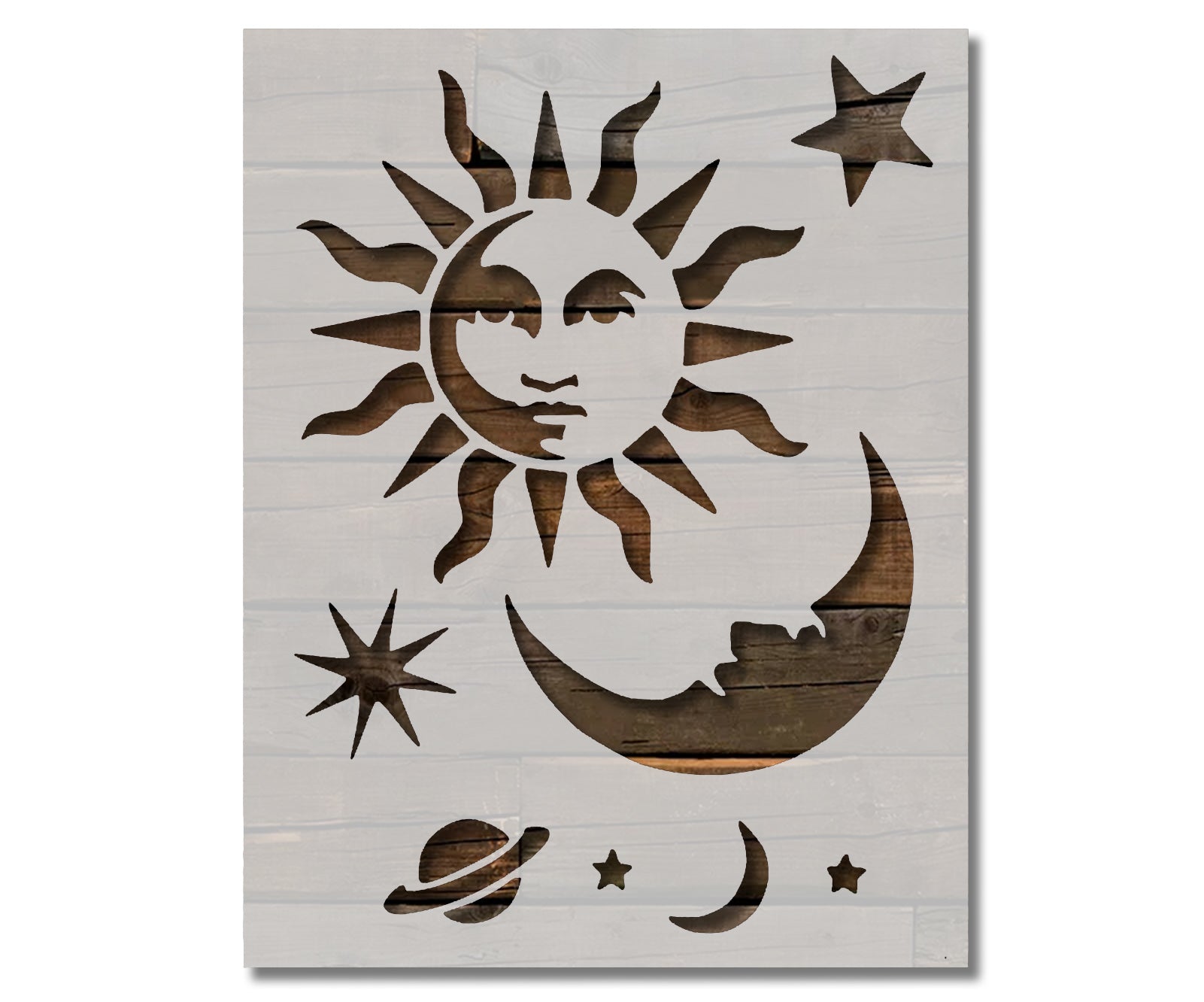 The stencil features detailed celestial imagery including suns, moons, and stars, making it suitable for wall décor, canvas art, furniture, and other creative projects. It is compatible with acrylic paints, chalk paints, spray paints, and inks, providing versatile applications for crafters of all skill levels. Its semi-transparent design allows for precise placement and professional-quality results.