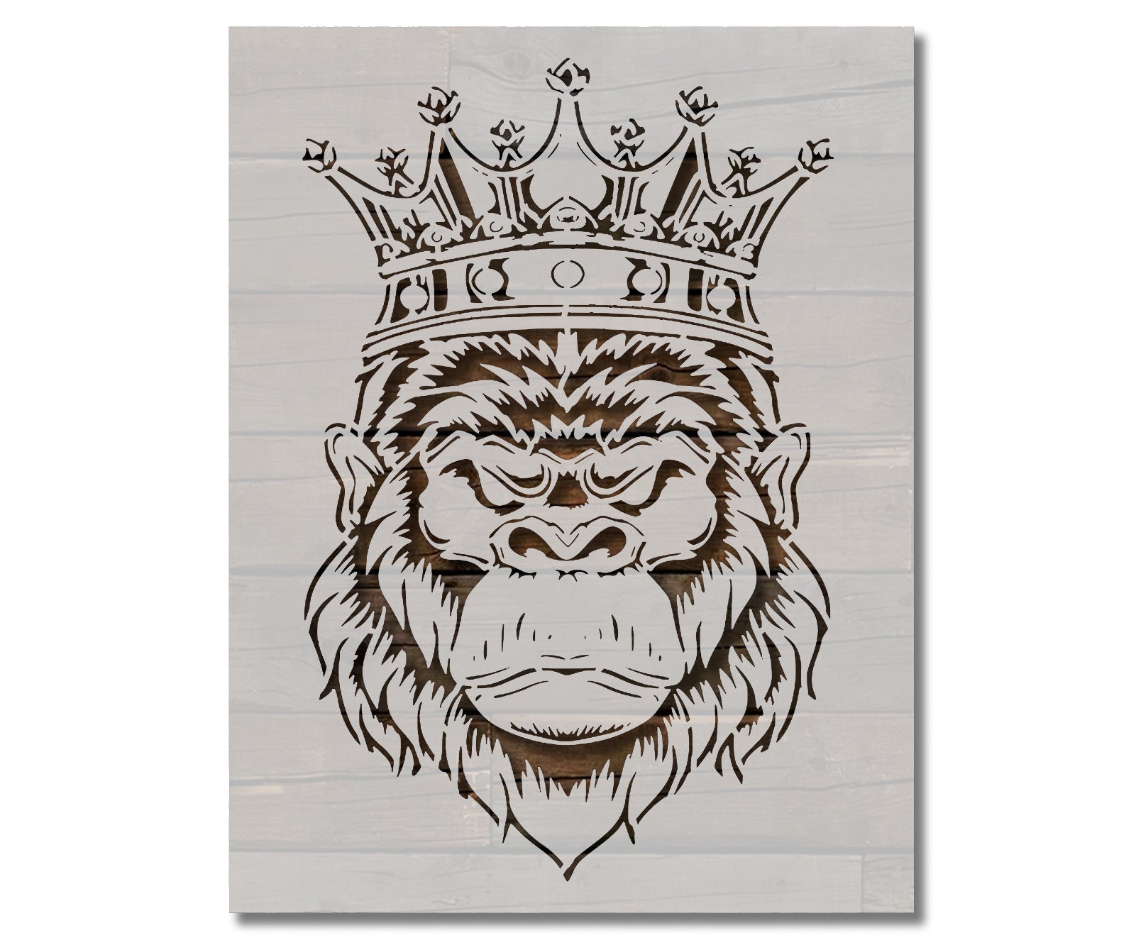 Create bold statement artwork with our Gorilla King Stencil. Featuring a powerful gorilla silhouette with crown detail, this stencil is perfect for modern art projects, wall décor, canvas painting, signs, apparel, and more.
