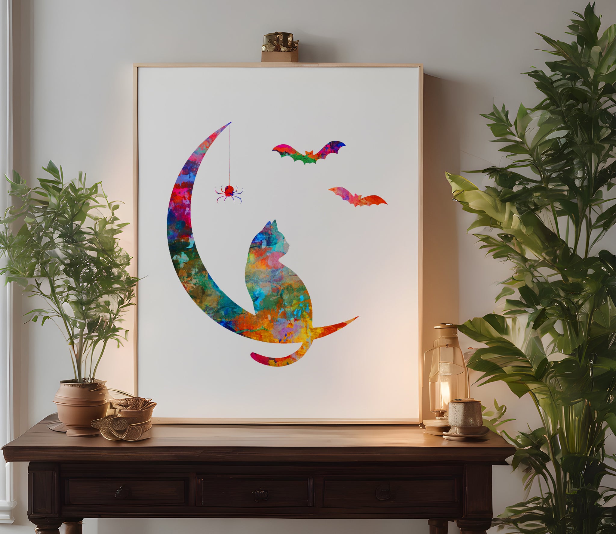 Capture the magic of Halloween night with our Halloween Cat on Moon with Bats Stencil. This charming silhouette scene features a cat perched on a crescent moon surrounded by flying bats — perfect for creating atmospheric seasonal décor.