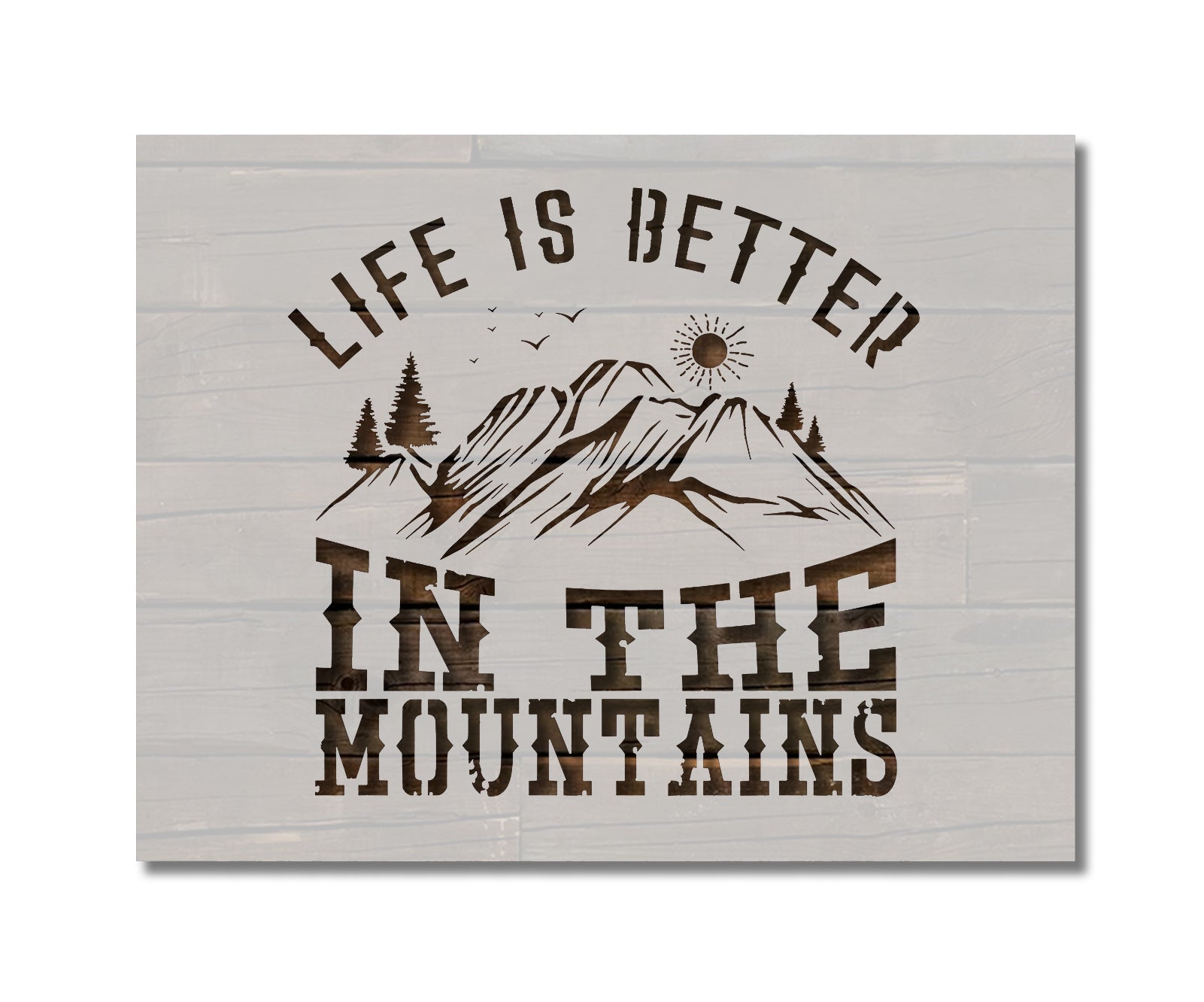 The stencil displays the phrase “Life is Better in the Mountains” with scenic mountain imagery, ideal for lodge or farmhouse décor.