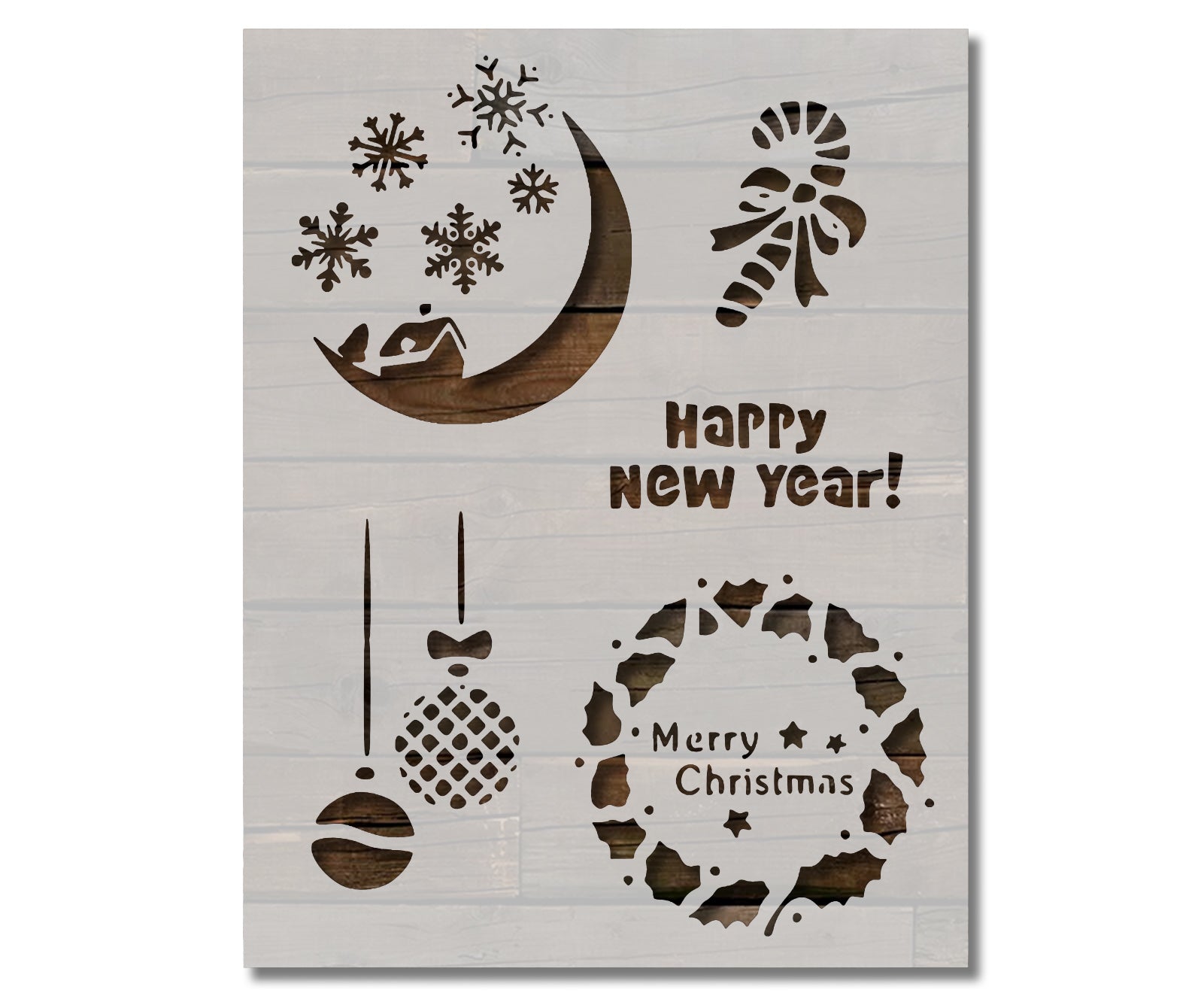 Spread holiday cheer with the Merry Christmas Candy Cane Snowflakes Happy New Year Stencil. Featuring a festive combination of candy canes, snowflakes, and celebratory text, this stencil is perfect for seasonal wall décor, cards, gift wrap, canvas projects, and decorative furniture. Its playful and joyful design makes it ideal for both kids’ and adults’ crafts, bringing the spirit of the holidays to every project.