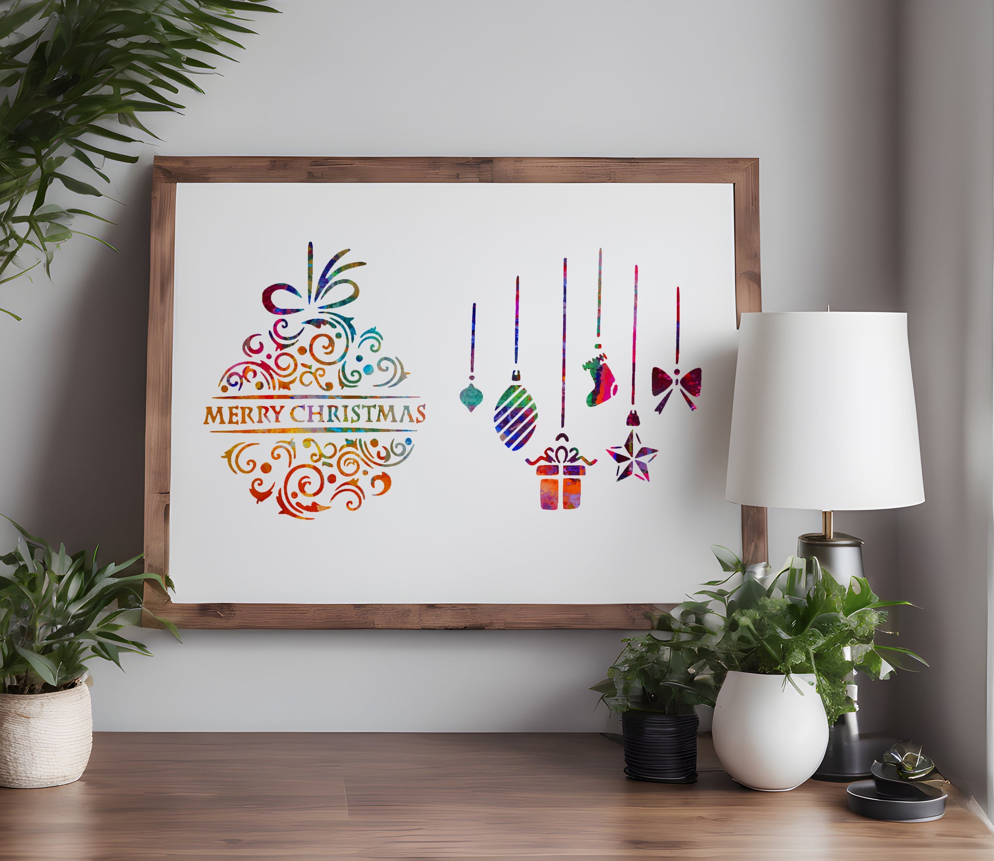 Add festive charm with the Merry Christmas Ornament Bow Star Present Stocking Stencil. Featuring classic Christmas symbols like ornaments, bows, stars, presents, and stockings, this stencil is perfect for wall décor, cards, canvas art, gift wrapping, and furniture decoration. Its playful design brings the magic of the holidays to every craft project.