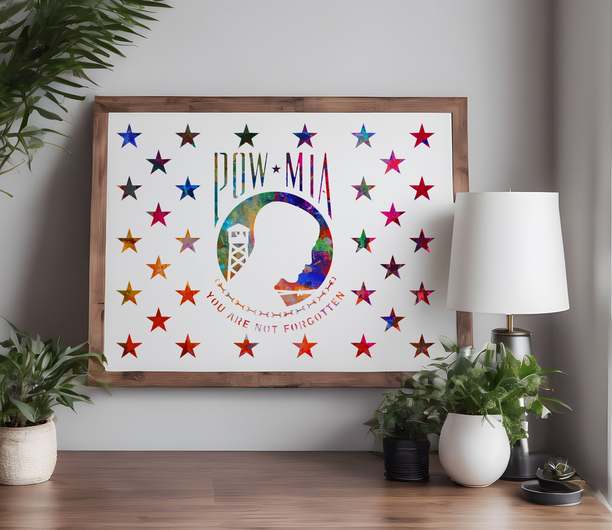 Create respectful and meaningful tribute projects with this POW-MIA Flag Union stencil. Ideal for wooden flags, plaques, memorial displays, decals, apparel, and patriotic décor.