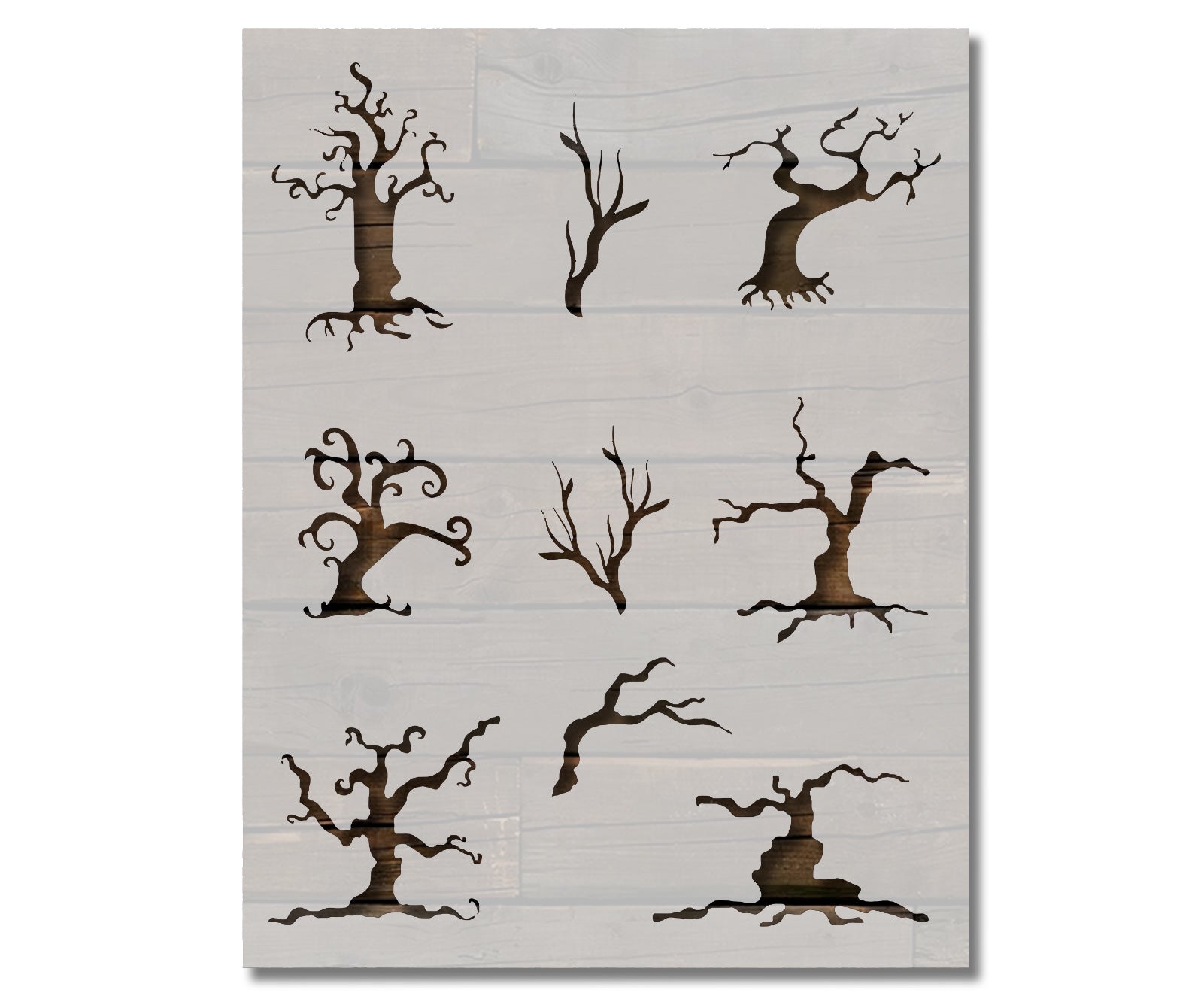 Create haunting woodland décor with our Spooky Halloween Trees Stencil. Featuring eerie twisted trees, this versatile stencil is perfect for Halloween porch signs, party decorations, canvas art, wood projects, and spooky seasonal crafts of all kinds.