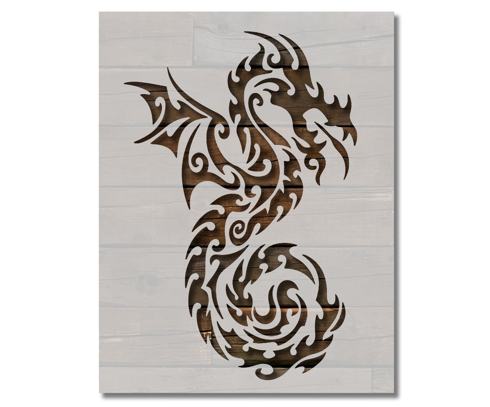 The Tribal Dragon Seahorse Stencil blends fantasy and ocean-inspired design into one striking pattern that is perfect for creative décor and crafts. The flowing tribal lines and curled tail create movement and elegance, making this stencil a favorite for nautical, boho, and mystical-themed projects. Use it for painting wall art, decorating furniture, beach house décor, personalizing journals, giftmaking, or clothing embellishment.